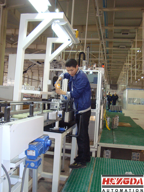 隨著汽車(chē)工業(yè)的發(fā)展,發(fā)動(dòng)機(jī)裝配線 的自動(dòng)化程度越來(lái)越高,發(fā)動(dòng)機(jī)裝配線主要由活塞連桿分裝線、缸蓋分裝線、總成裝配線組成。具體的設(shè)備大致包括:摩擦輸送線、托盤(pán)、打號(hào)機(jī)、激光標(biāo)簽打印機(jī)、翻轉(zhuǎn)機(jī)、缸孔噴油裝置、活塞插入輔助裝置、曲軸分組號(hào)攝像識(shí)別裝置、主軸瓦選配裝置、氣門(mén)插入翻轉(zhuǎn)臺(tái)、氣門(mén)拍打裝置、活塞銷(xiāo)壓裝機(jī)、潤(rùn)滑油噴嘴壓裝及檢測(cè)機(jī)、氣門(mén)油封壓裝機(jī)、缸蓋水管接頭壓裝機(jī)、火花塞導(dǎo)管壓裝機(jī)、主軸承蓋螺栓擰緊機(jī)、連桿螺栓擰緊機(jī)、缸蓋螺栓擰緊機(jī)、凸輪軸蓋螺栓擰緊機(jī)、正時(shí)鏈蓋擰緊機(jī)、油底殼擰緊機(jī)、曲軸皮帶輪螺栓擰緊機(jī)、主軸承蓋螺栓松開(kāi)機(jī)、連桿螺栓旋松機(jī)、總線控制系統(tǒng)與信息管理系統(tǒng)、裝配線工具、量檢具、通用料架、智能料架、冷試臺(tái)架、機(jī)械挺柱選配裝置、氣門(mén)鎖夾壓裝機(jī)、涂膠及機(jī)油加注設(shè)備、泄漏檢測(cè)設(shè)備、曲軸端隙及扭矩測(cè)量裝置、曲軸回轉(zhuǎn)力矩檢測(cè)+油道試漏、MPI試漏機(jī)、缸蓋泄漏試驗(yàn)機(jī)、長(zhǎng)缸油路試漏機(jī)、長(zhǎng)缸水路試漏機(jī)。