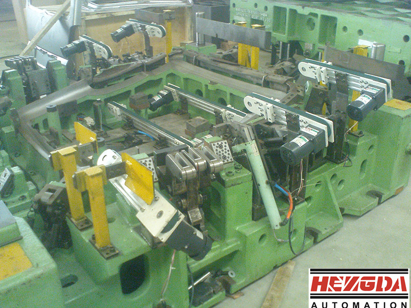 一種可切換式汽車門蓋包邊模輸送裝置,用于解決現有汽車門蓋包邊模輸送裝置輸送車型單一問題。其技術方案是:它包括機架和設置在機架上的左、右輸送帶機構,改進后:左、右導向機構分別包括滑軌、滑塊、導向座、導向板和氣缸,氣缸經氣缸架與機架固定,氣缸桿連接滑塊,滑軌與機架固定,導向座固定在滑塊上,導向板固定在導向座上部,滑塊、滑軌滑動連接。本實用新型的左、右導向機構...
